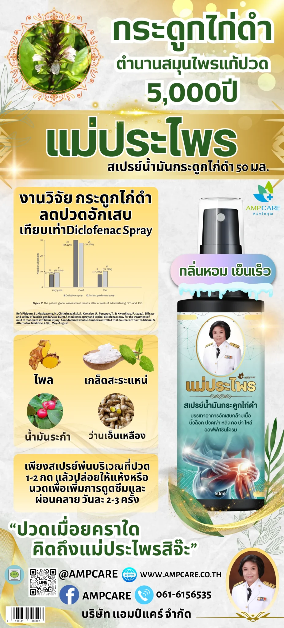 กลิ่นหอม เย็นเร็วใน 1 นาที ให้คอ บ่า ไหล่ หลัง ขา เบาสบายด้วยพลังสมุนไพรไทยเข้มข้น 5 ชนิด “กระดูกไก่ดำตำนานสมุนไพรพันปี" ผ่อนคลายจากความเมื่อยล้าและความตึงหลังการทำงานหรือออกกำลังกาย แค่พ่น2กดเบาๆ ซึมไว ไม่เหนียวเหนอะหนะ ไม่เลอะเปื้อนมือ พัฒนาสูตรโดยเภสัชชำนาญด้านสมุนไพร